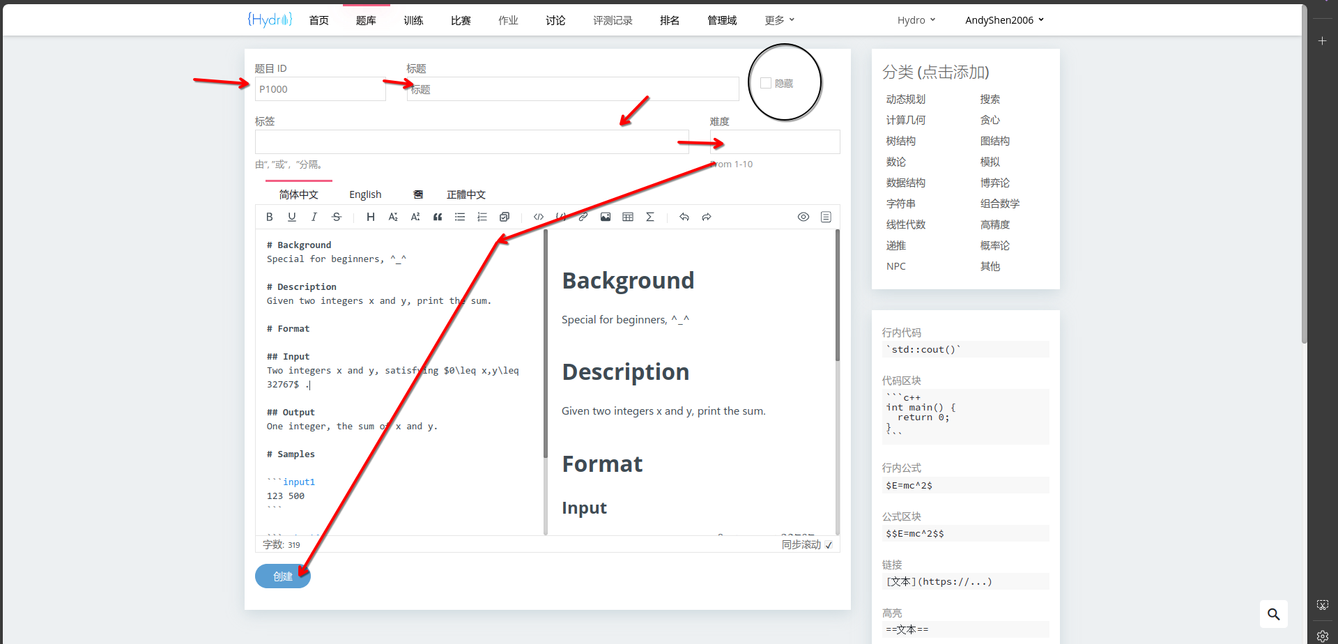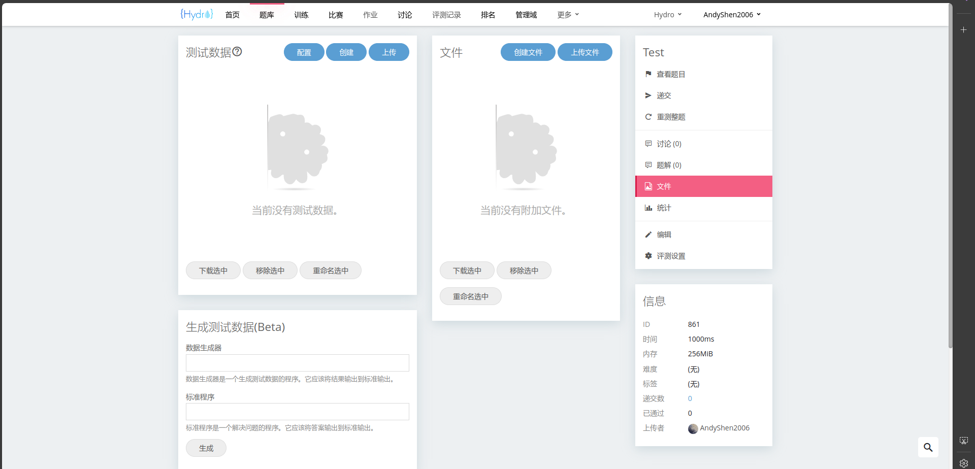 在这个页面中依次填写题目 ID,标题,标签,难度,题面。题目 ID 一般用字母+数字的形式,通常的题目应该都是用户自出题,应该用 T 开头,也就是 T5,T6...(建议查看题库查询 T 开头题目最大编号,避免重复)。然后填写标题,标题可以用类似“【十月月赛】xxx”的形式,前面用一个方括号代表题目来源。标签和难度是可选的,对于选考班,建议难度都设置为 1(因为一般比较简单),标签一般只要写出题年份就行。题面的话一般是题目背景、题目描述、输入/输出格式,提示/说明。题面的输入使用 Markdown 格式,具体语法建议自行百度,此处不多赘述。在做完这一切后,可以按照用途选择是否隐藏:如果是比赛试题,建议隐藏;如果是练习题目,就不必要隐藏。隐藏后除了管理员以及部分题目志愿者外无权限进行查看,具体权限安排请联系 AndyShen2006 或 chala_tea。
